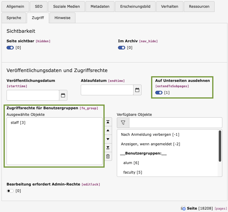 TCEMAIN.clearCacheCmd = 5514 - Geschützter Newsletter: Falls es sich um einen internen (zugriffsgeschützen) Newsletter handelt, muss die Seite kurzfristig auf eine normale Seite geändert werden, damit die entsprechende Benutzergruppe ausgewählt werden kann. Option „Extend to Subpages“ aktivieren, damit die Berechtigung auch für alle Unterseiten gilt.