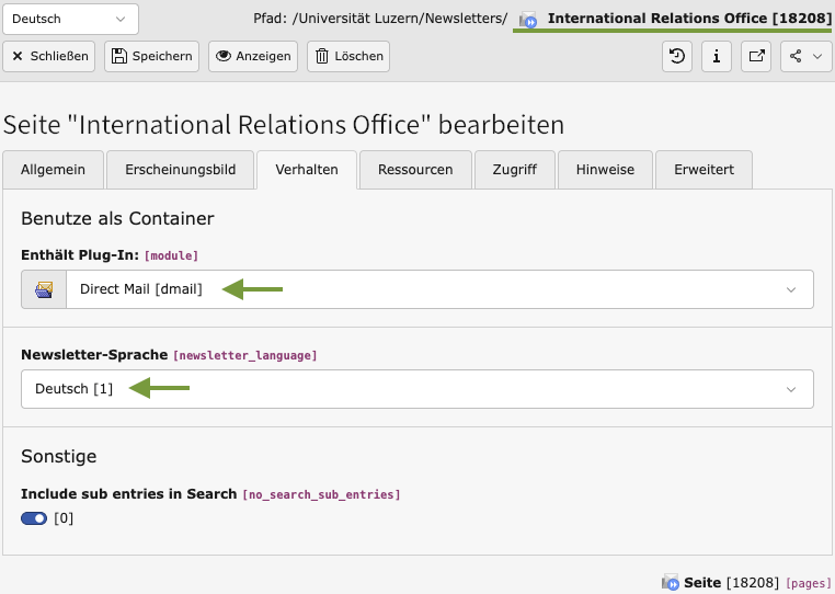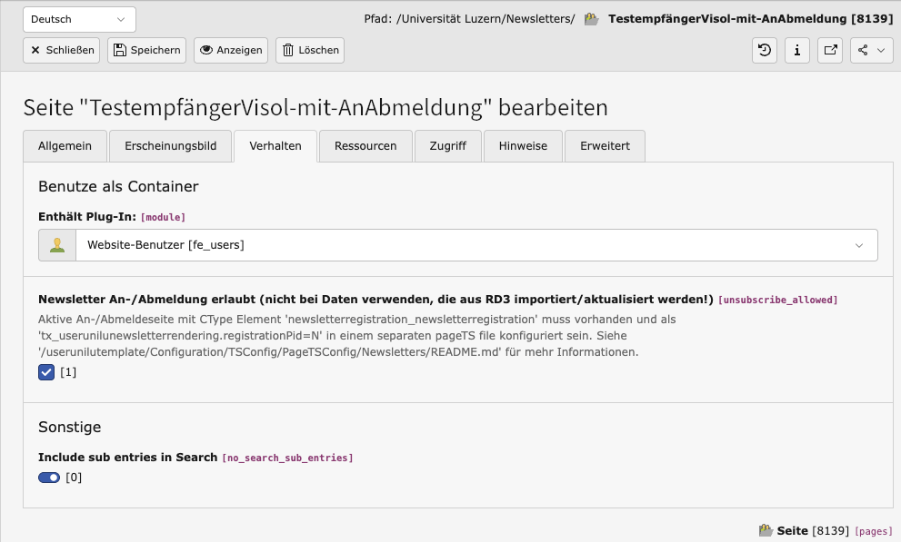 TCEMAIN.permissions.groupid=149. Im Reiter „Verhalten“ die Newsletter-Sprache auswählen (ist relevant für die persönliche Anrede und den Abmelde-Link).