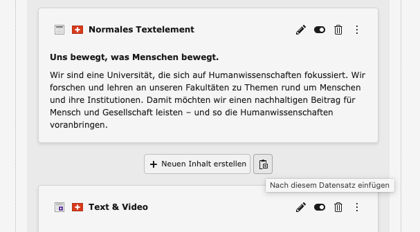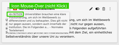Kopieren: Das erste Icon auf dem Balken enthält die ID des Inhaltselements und ermöglicht das Kopieren. Kontextmenü über Icon des Elements öffnen → „Kopieren“ → Klemmbrett-Symbol an der Stelle anklicken, wo das Inhaltselement eingefügt werden soll.