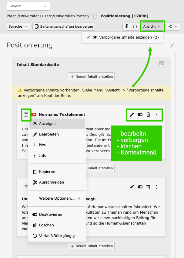 Grundfunktionen zur Bearbeitung eines Inhaltselements: bearbeiten, verbergen, löschen. Weitere Funtkionen sind unter dem Symbol mit den drei Punkten und dem Icon des Inhaltstyps zu finden.
