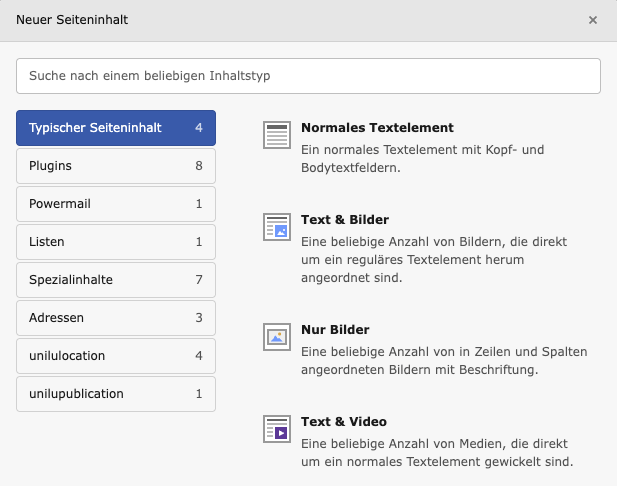 Im Reiter Unilu oberhalb der Arbeitsfläche kann eine Adressvorlage gewählt und mittels Drag & Drop, oder dem normalen Einfügen eines Inhaltselements, an der gewünschten Stelle platziert werden.