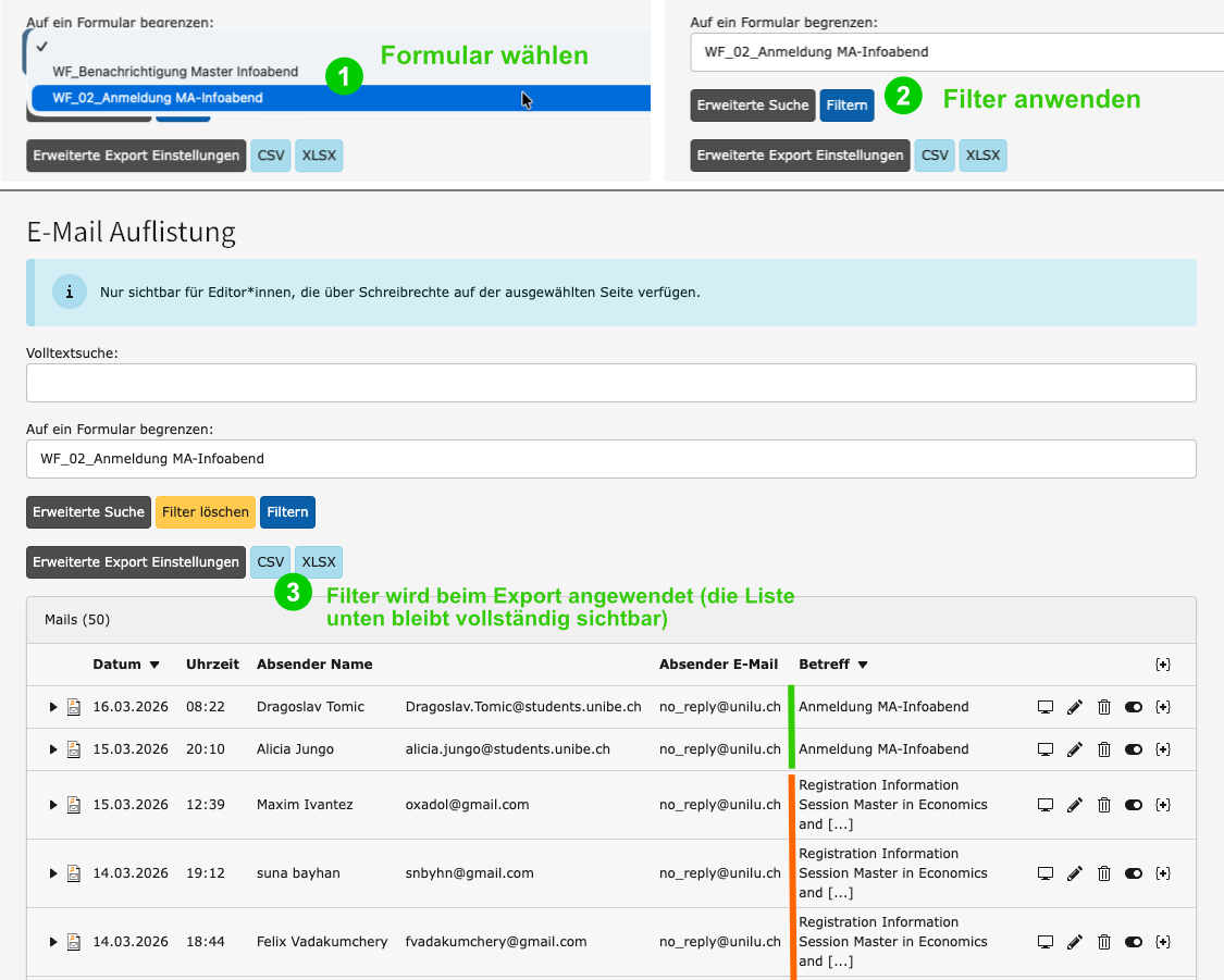 Um alte Anmeldungen oder Tests (Mails) zu löschen, können die gesuchten Daten per Filter selektiert werden.
