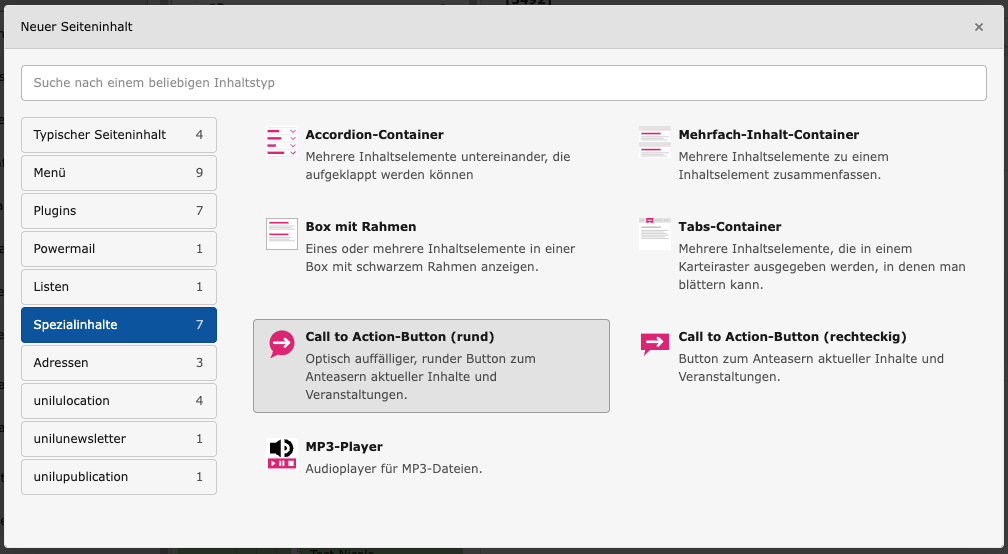 Container-Elemente werden über die Schaltflächen [+ Inhalt] Einfügen-Dialog unter dem Reiter „Spezialinhalte“ ausgewählt.