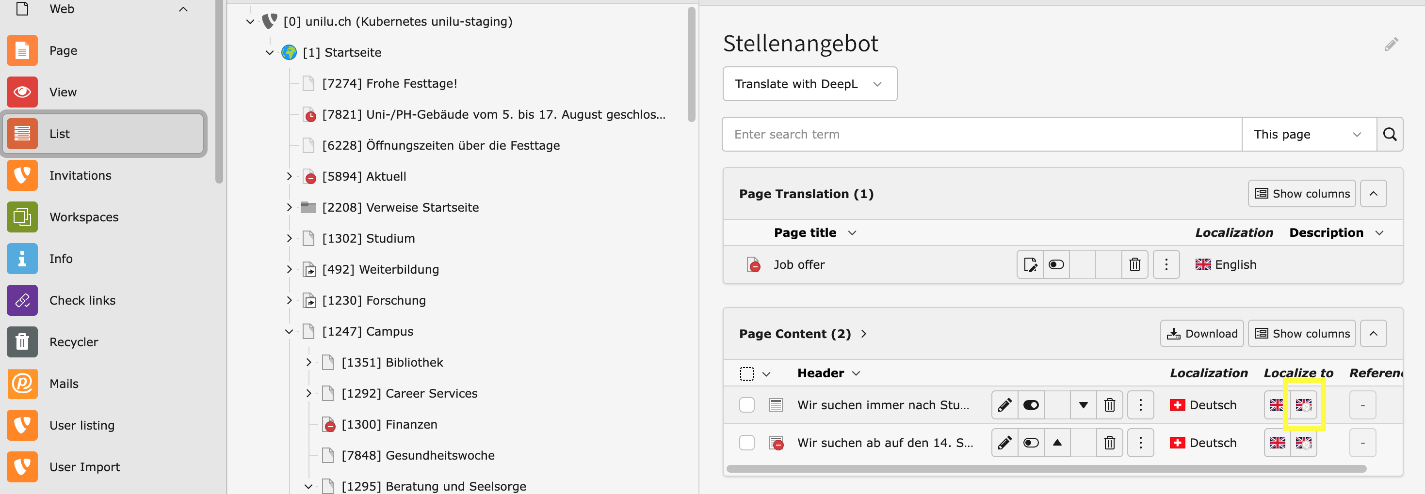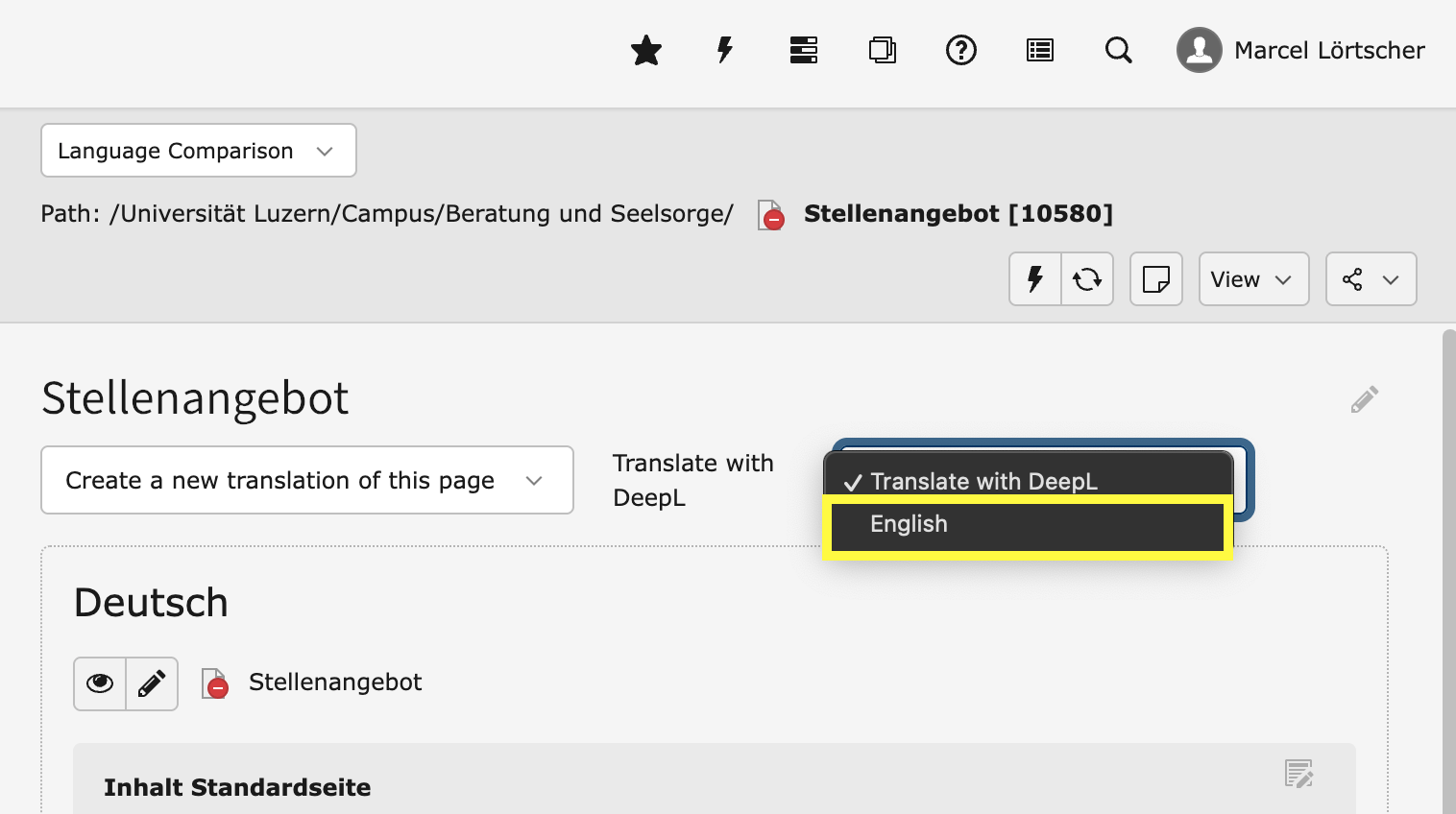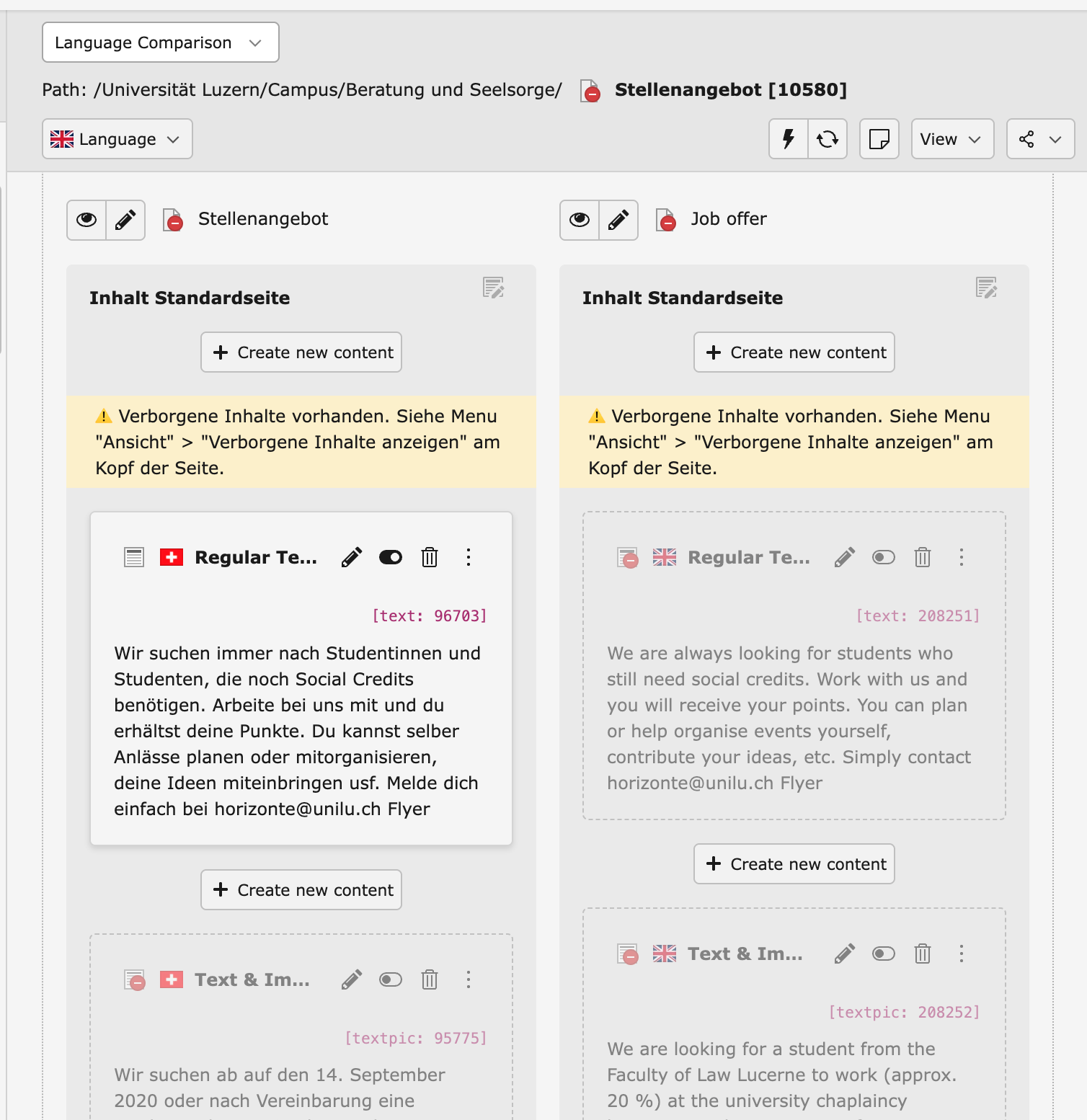 Jede Seite, jedes Inhaltselement und jeder Datensatz auf der Website kann übersetzt werden. Die Website der Universität Luzern existiert in den Sprachen Deutsch und Englisch, wobei es Seiten geben kann, die nur in einer der Sprachen existieren.