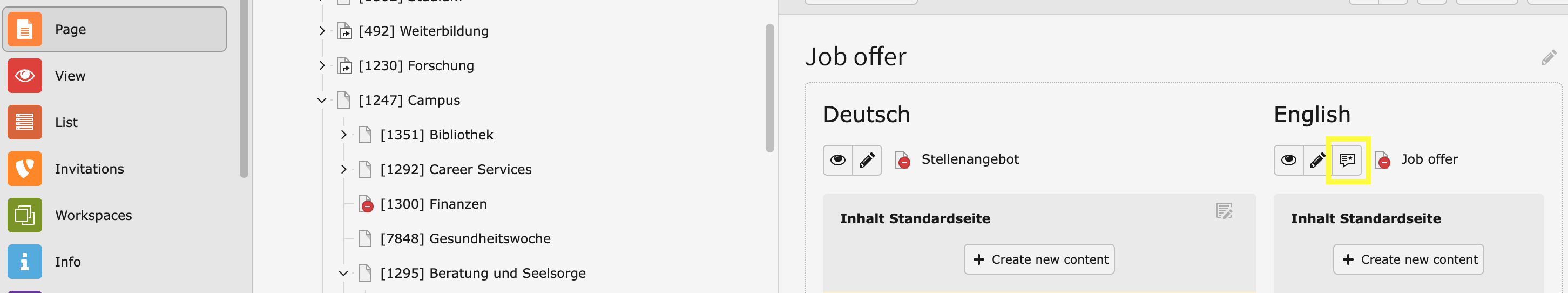 Die englische Version einer deutschsprachigen Originalseite wird in der „Sprachen-Ansicht“ geschaffen.